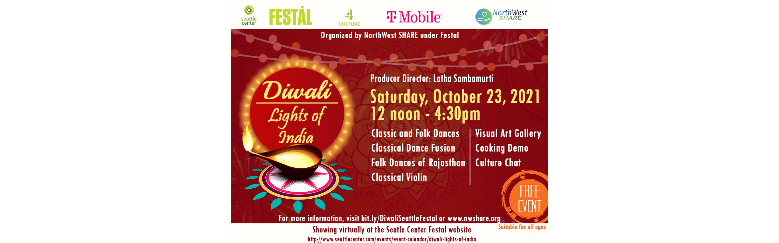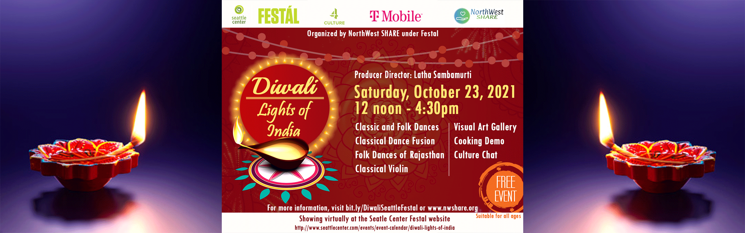 DIWALI: LIGHTS OF INDIA IS PART OF THE VIRTUAL FESTÁL SERIES WITH GENEROUS SUPPORT FROM 4CULTURE. THE 2021 THEME, “WHERE THE WORLD GATHERS” LINKS TOGETHER THE SERIES OF 24 FREE FESTIVALS PRESENTED THROUGHOUT THE YEAR, EACH WITH A UNIQUE CULTURAL FOCUS, IDENTITY, AND A RANGE OF ENGAGING ACTIVIties